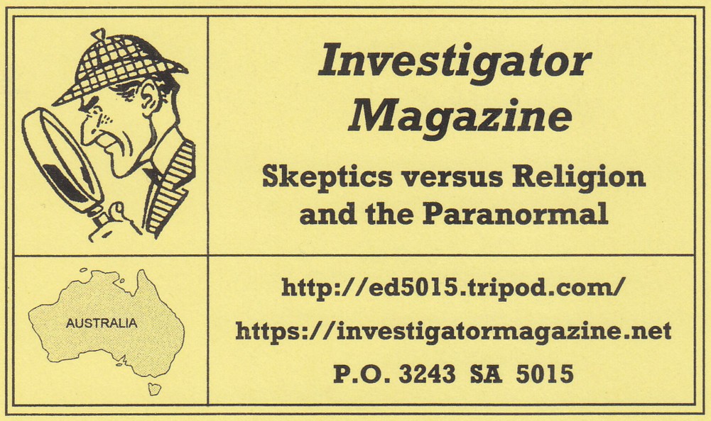 In this edition: We have the Index to Investigator 2 to 74. A separate index to the "Brief Report" sections is planned for January. Harry Edwards, author and skeptic of NSW, writes on Spontaneous Human Combustion and concludes that: "unreliable circumstantial evidence abounds." Lance Storm – Adelaide University Ph.D student in psychology – investigated ESP in vision-impaired and sighted subjects. He discusses why sighted subjects got the higher score. We see Investigator's whimsical side in Movie Cliches, Oh deer I got it awl rong!, and in the reprint of one of the earliest investigations, done in 1988 – Zambian Spaceflight. Burjin J Kotwall found his long-ago debate with "Anonymous" on the Bible "debilitating". (No. 73 p. 4) John H Williams perhaps felt the same way when he wrote, "I will not be responding to anything he writes in future." (No. 72) Mr Williams has now recovered and will be joined in January by Keith Cornish, president of the Atheist Foundation. Epic Bible Battles lists Bible Debates so far since No. 60. The previous special