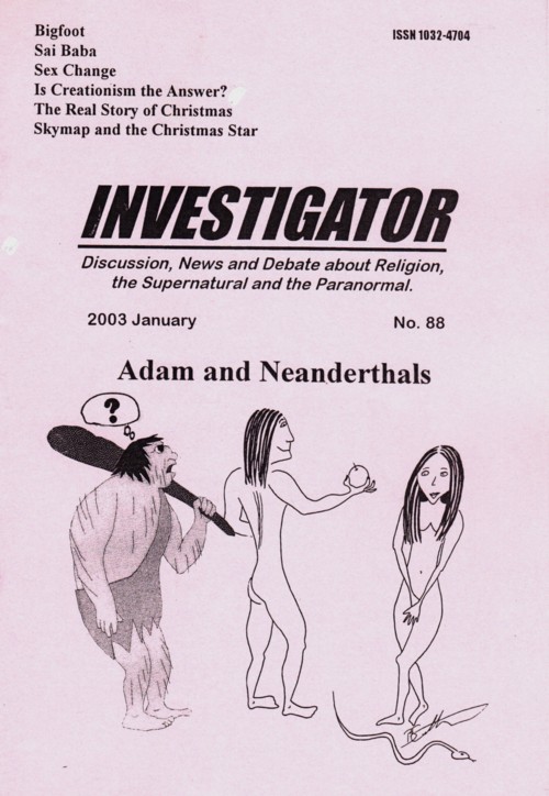 Kirk Straughen (Investigator 87, 2002 November) In his article Adam and Eve (# 86) Anonymous concludes his argument with the following statement: "Clearly, it's more scientific at present to attribute our ancestors to "Adam and Eve" than to Neanderthals." (p. 12). In my opinion this statement is not supported by science. The Neanderthals form part of the hominid evolutionary tree that is best seen not as a simple linear chain, but as a multi-branched structure with many dead ends. Homo sapiens and Neanderthals most likely evolved from a common ancestor, rather than Homo sapiens directly from Neanderthals. Naturally, there is considerable debate between paleoanthropologists on the relationships between the various hominid species; however, I can't see how this justifies Anonymous' quoted conclusion. Indeed, Anonymous offers no sound evidence in support of the view that humans were divinely created and interbred with naturally evolving hominids. He refers to articles discussing mitochondrial Eve – the source of our mitochondrial DNA. The tern 'Eve,' however, is somewhat misleading – this woman was a member of a population of perhaps 10,000 humans, certainly not the sole female representative of our species. By contrast, many Christians see evolution as the process by which God brought humanity into being, and regard Genesis for what it is – a prescientific creation myth that is an example of early man's attempt to account for human origins. This