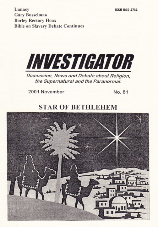 Anonymous (Investigator 88, 2003 January) The computer program "SKYMAP" confirms some of the Christmas Star information I supplied in Investigator 81. I argued in #81 that the Star of Bethlehem was a twice-over conjunction of the planets Venus and Jupiter – occurring August 12, 3 BC and June 17, 2 BC. Venus and Jupiter are the two brightest objects in the night sky after the Moon. Their conjunction – or apparent joining together as viewed from Earth – would look spectacular compared to the usual night sky, besides being a significant event to astrologers. SKYMAP supplies diagrams of the sky, as seen from almost any country on Earth, for any date and time between 4000 BC and 8000 AD. The software also gives the rising and setting times for Sun, Moon and planets for any day one chooses. The "wise men" – more likely astrologers – stated, "For we have seen his star in the east." (Matthew 2:2) SKYMAP shows that on August 12, 3 BC, Venus and Jupiter rose together – so close they seemed joined – in the east. In Iraq they were 4o above the horizon at 4am and 19o above the horizon at 5.17am at which time sunrise started. These times and altitudes varied slightly from country to country. The conjunction, however, was visible to the east, wherever clouds or mountains didn't obscure it, for about an hour before sunrise throughout the ancient world from Morocco to China. There was no interference from moonlight that morning as the Moon, on that day, rose at 6.34 and set at 19.38 (7.38 pm). The theory is that this 3 BC Venus/Jupiter conjunction motivated the "wise men" to head for Israel. As astrologers they would have calculated that Venus and Jupiter would meet again ten months later but in the west rather than the east – and after sunset rather than before sunrise. What, then, happened at the second conjunction – June 17, 2 BC? SKYMAP