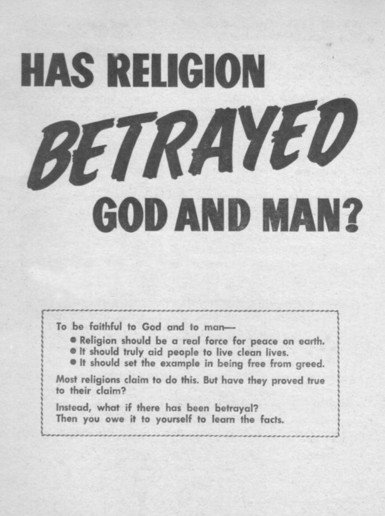 In 1973 the JWs Organization recommenced publishing Kingdom News pamphlets (suspended since 1946) of 4 pages each and titled: • 1973: Kingdom News No. 16, Is Time Running Out for Mankind? • 1973: Kingdom News No. 17, Has Religion Betrayed God and Man? • 1974: Kingdom News No. 18, Government By God - Are You For It Or Against It? ![]() Kingdom News No. 17