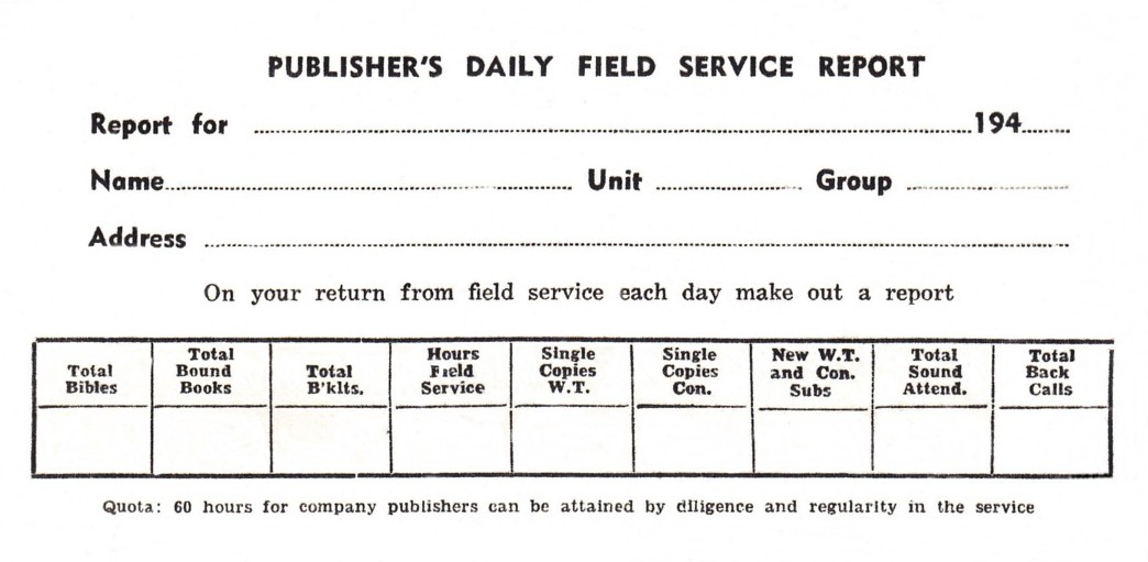 They reported this "service work" on a daily report form; then after WWII on weekly forms, and eventually monthly. They also recorded the number of booklets, books and magazines they sold or distributed and, after WWII, "Bible studies" conducted.