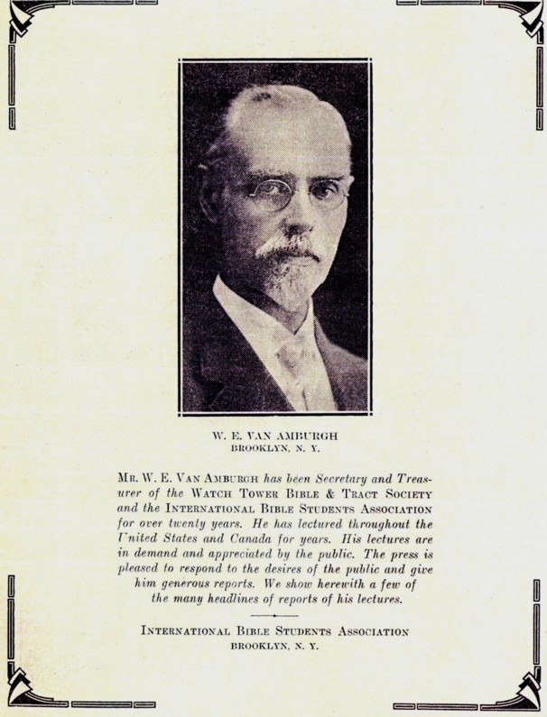 Van Amburgh was also in the five-man Editorial Committee that Russell, in his  Will and Testament (The Watch Tower December 1, 1916), appointed to determine the contents of The Watch Tower after his death.