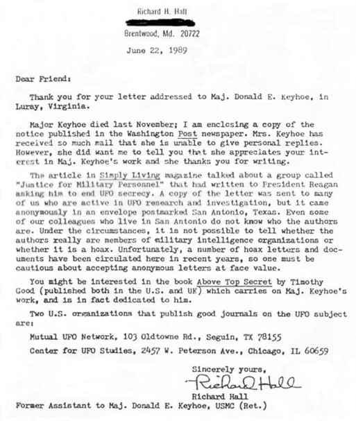 •    The recipient of the third letter, Major Keyhoe, was dead. However his former assistant replied by letter