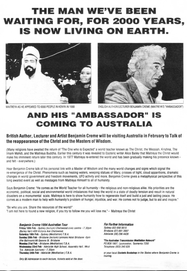 (Investigator 36, 1994 May) ![]() Sitting in a semi dark hall and holding hands with two other males was not my idea of a fun evening. "Transmission meditation" with the meditators holding hands, supposedly transmits energy to where it can best advance human evolution. About 55 people gathered in Adelaide on the special occasion of Benjamin Creme's visit. Creme, 72, claims Christ returned in 1977 and since 1991 is making appearances more and more often to people all over the world. Christ communicates with Creme telepathically who then passes on the messages. "Christ" is an office or position, previously held by the "Master" Jesus, and now held by another "Master" Maitreya. The appearances of "Christ" are regularly listed and reported in the monthly newsletter of the "Tara Center" called The Emergence. A special information issue of Share International, a magazine edited by Creme, says: "Eventually Maitreya will inaugurate a new world religion ••• "[It] will be a fusion and synthesis of the approaches of East and West." The degree of the intended "synthesis" is indicated by the variety of ideas and topics in Share International. These include reincarnation, Hercules, Buddha, Karma, interplanetary travellers, miracles, Lemuria, etc. About 18 1/2 million years ago beings from other planets, notably Venus, came to Earth and helped primitive mindless humans to evolve minds. The seating arrangement of the 55 people was U-shaped. Females were on one side of the "U" and males on the other. The exception was the curve of the "U" where Creme sat with six females on either side of him. Every person held hands with his neighbours in silence. When someone left then the last person in the tail of the "U" moved in to take his place. Every ten minutes or so Creme called out: "Keep your attention high at the top of your head!" It was a long 3 1/2 hours. Worldwide there are over 700 meditation groups holding weekly meetings.