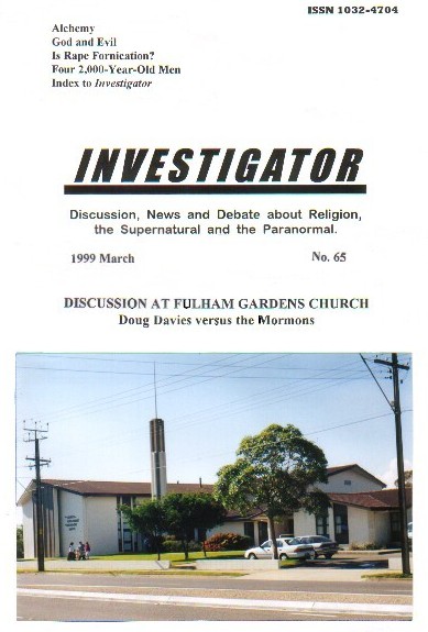All these things were reported in Investigator 61. On January 31 this year (1999) Mr Davies returned to Fulham Gardens for more discussion about John but nobody seemed interested! Sister Worthen, a missionary from America, stated: "Everyone I know who prayed sincerely about whether the Church's teachings are true received the assurance that they are." Mr Davies was then led outside and left alone. A discussion started with a new convert who happened to be nearby. Other Mormons then came out one after another and formed a semi circle. These included Shirralee (former missionary to the Philippines and now a college student), Robert Goddard (teacher in computing) and Tony Russo. Mr Davies
