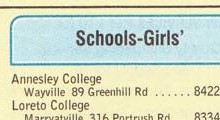 I have now seen the extract from the Adelaide Yellow Pages reproduced in Investigator 172 (p 47).  The use of a hyphen rather than a dash (or a comma) strikes me as odd but is not confusing; the apostrophe in the word Girls' makes sense if the entire expression Girls' Schools has been reordered for the alphabetical sequencing of the directory.